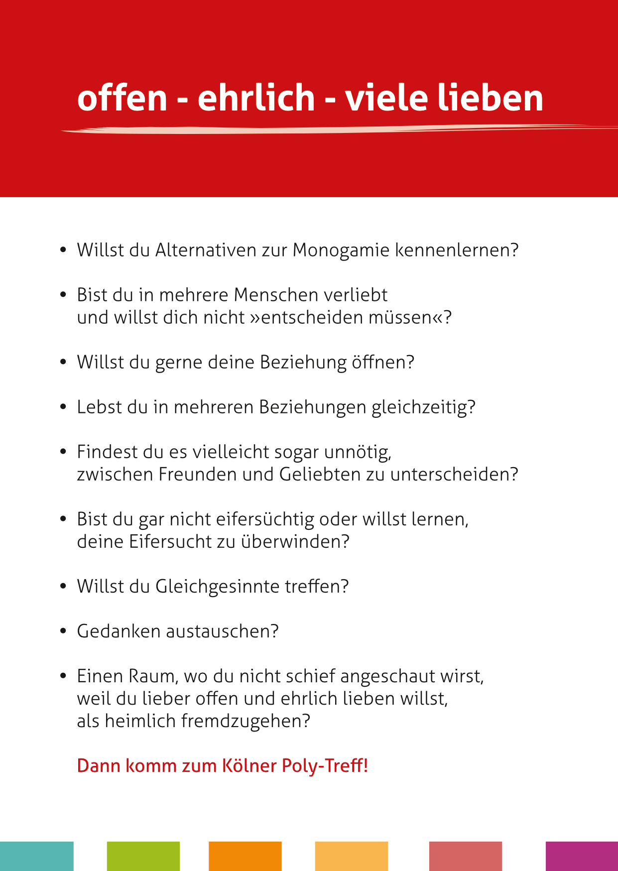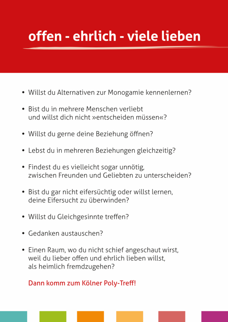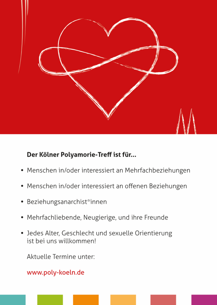 Hier könnt ihr den Flyer des Polyamorie-Treff Köln ansehen oder auch herunterladen. Zudem lassen sich hierin weitere Informationen dazu finden, worum es bei Mehrfachbeziehungen geht. Die Texte wurden von Kirstin erstellt, das Design von Simon. Bei Verwendungsfragen bitte übers Impressum der Webseite anfragen.
