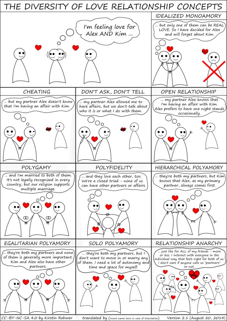 Hier seht ihr das Schaubild (beziehungsweise den Cartoon) von Kirstin, zur Vielfalt der Liebesbeziehungskonzepte, in der deutschen und englischen Version. Die Grafik dient als Anregung zum Verständnis und kann für den Austausch miteinander hilfreich sein. Ihr dürft den Cartoon gerne teilen oder auch weiterbearbeiten. Bitte beachtet in dem Fall die Urheber- und Bearbeitungshinweise.