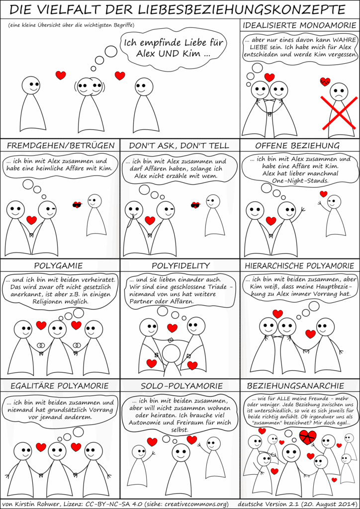 Das Wort „Polyamorie“ ist aus zwei griechisch-lateinischen Wortbestandteilen zusammengesetzt: Poly (viel) und Amor (Liebe). Bei Polyamorie handelt es sich um ein nicht-monogames Beziehungsmodell, das die Möglichkeit eröffnet, Liebesbeziehungen mit mehreren Menschen einzugehen, im Einverständnis mit allen Beteiligten. Da polyamore Beziehungen vielgestaltig sein können, zeichnet sich jede Beziehung (oder jedes Netzwerk) durch einen fortwährenden Entwicklungs- und Lernprozess aus. Im Verlauf kann sich auch Mitfreude einstellen oder ein Zugewinn an Achtsamkeit im Umgang mit sich und anderen bemerkbar machen… Über den folgenden Link könnt ihr den ganzen Artikel lesen oder das PDF-Dokument herunterladen: Polyamorie: Liebe hat viele Farben